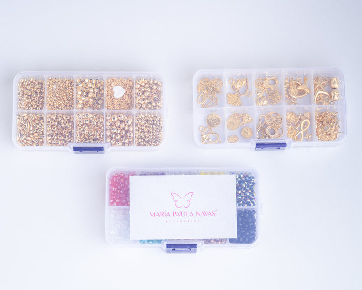 Incluye caja de separadores, dijes y cristales de 10 espacios cada una.